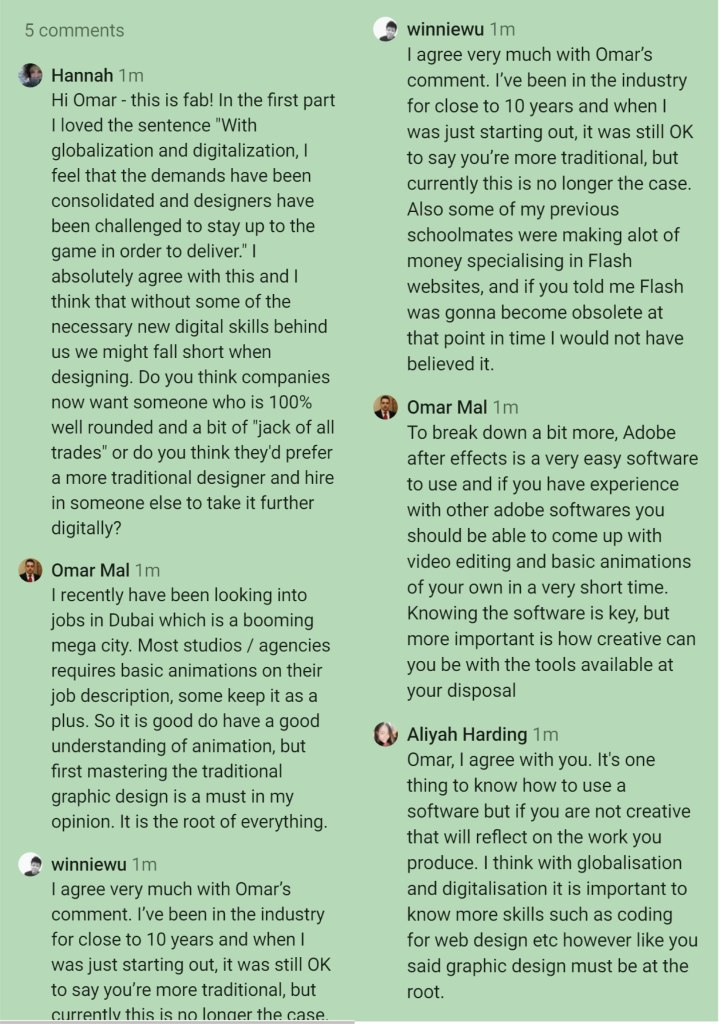 Majority of our discussions this week were regarding how living ina very digital world affects the work we do. My blog post on this sums up how I feel but it’s been amazing to see other’s view points too – to be able to talk to others who have longer experience within this industry is a valuable insight into the past work they’ve seen and how it’s changed over time. Again, most of our discussions came back to the same topic of “Creativity”. It’s ok talking about the effects of digitalisation but at the very crux of it all, creativity is the back bone to everything we do in Design. Is Globalisation making all design “homogenised”? Is the expanding digital world meaning more people can come into Graphic Design with basic Adobe skills and no creativity? When will the divide between individuality and commonality become so blurred we don’t know what’s original?