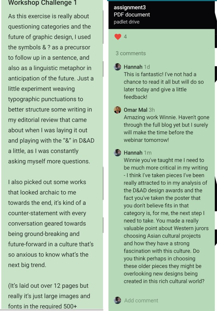 However, in having a week like this that has squeezed all the critical thinking out of us has produced some amazing and surprisingly creative work. I have to acknowledge Winnie’s blog. I find it fascinating reading about Globalisation and digitalisation from someone who is on the other side of the world – there’s no better way to analyse the changes throughout the world from someone who lives there. As ethnic Chinese Winnie discussed how she felt with Western Jurors choosing historical Asian pieces as a winning design. I had to ask if she felt in choosing these older cultural projects are they perhaps not exploring the new exciting talents coming from this area of the world? As Harriet mentioned in her interview Design needs to reflect not just what Westerners want to see but taking into account other cultures and modern representations of these cultures.