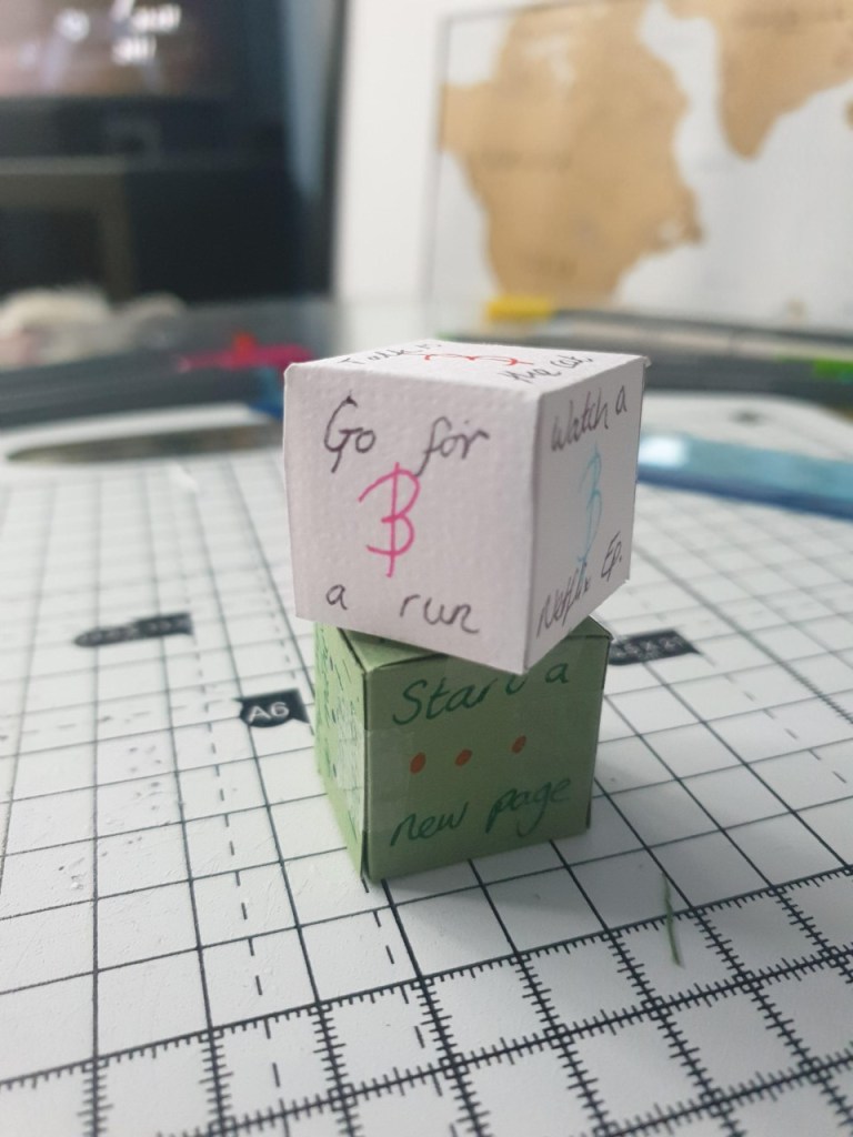 I had a sudden flash of inspiration that these dice can be added to, taken away or mixed up – If I start with just two dice with two different combinations on, I can see how that helps with future projects. I can then create more dice with more phrases or ideas on depending on the type of project or how I’m feeling.