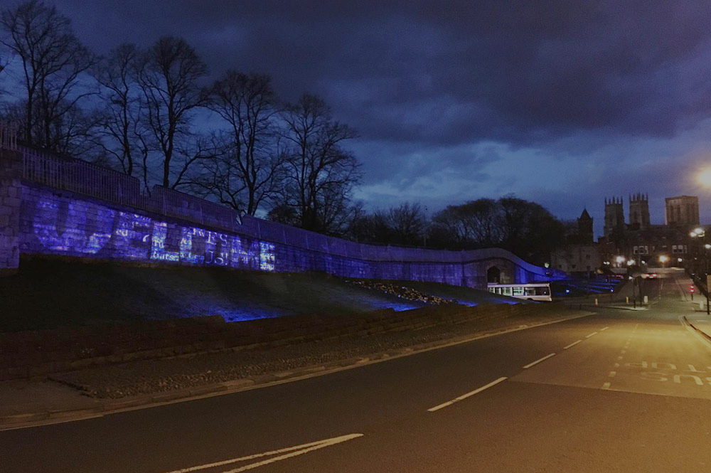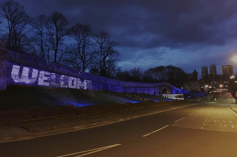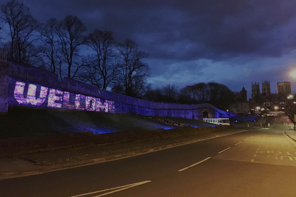 I experimented with different lighting and layers to create an effect of the projection against the city walls (a historic, symbolic barrier to protect the city). Alongside this, in combining with the word “WELCOME” containing the original negative message, there is a natural juxtaposition there and the positivity stands out.