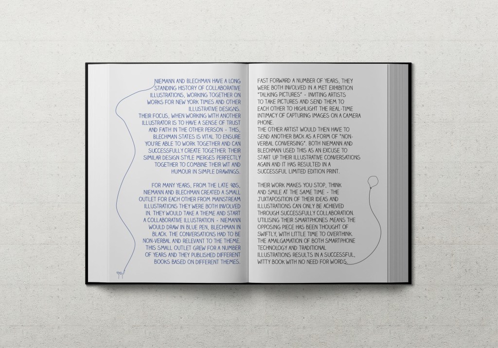 In regards to the design of this week’s piece, I really needed to highlight the child-like nature of Niemann/Blechman’s conversations. I chose a font which reflected handwritten scribbles – a formal font just wouldn’t be necessary when discussing their work. I downloaded the Claire Hand font and I think it works perfectly to reflect the personality of their collaborative work. I also added in some simple illustrations – this was more fun for me than a design feature but I think it’s also a really nice addition of my take on their work. I focussed on ensuring the left hand side was written in blue and the right hand side in black – again a direct representation of how they displayed their work in their book.