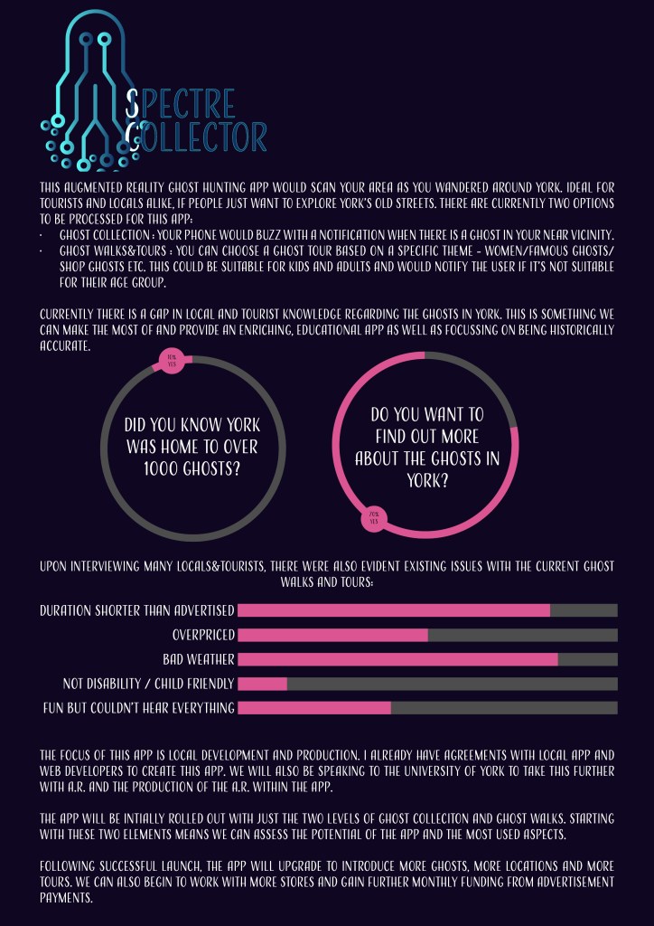This app would run in the background as you wandered around York. Ideal for tourists and locals alike if people just want to wander York’s old streets. Your phone would buzz with a notification when there is a ghost in your near vicinity. Open up the app and click on the icon notification – scan around your immediate vicinity and locate the ghost (a vaguely transparent figure) – it could be on the ground, up in the air or even in a shop next to you. You have to throw powder on the ghost to make it opaque and highlight it’s features etc – when you collect it into your pod, you get all the gory details about this ghost.