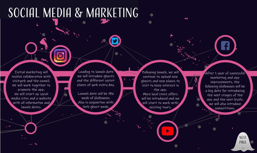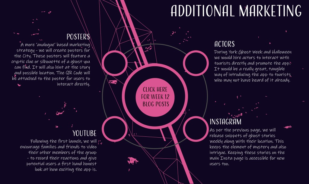 Alongside these strategies I’d also promote the app with YorkMix Media (a local independent news site but also a visitor page for tourists). VisitYork information centre and the train station for promotion and to put up posters of the ghost profiles. The shops and hospitality involved in the app would also actively promote the app – with small flyers and stickers in the windows. They could also be encouraged to do as above and promote their shop if they have a ghost there which most will.