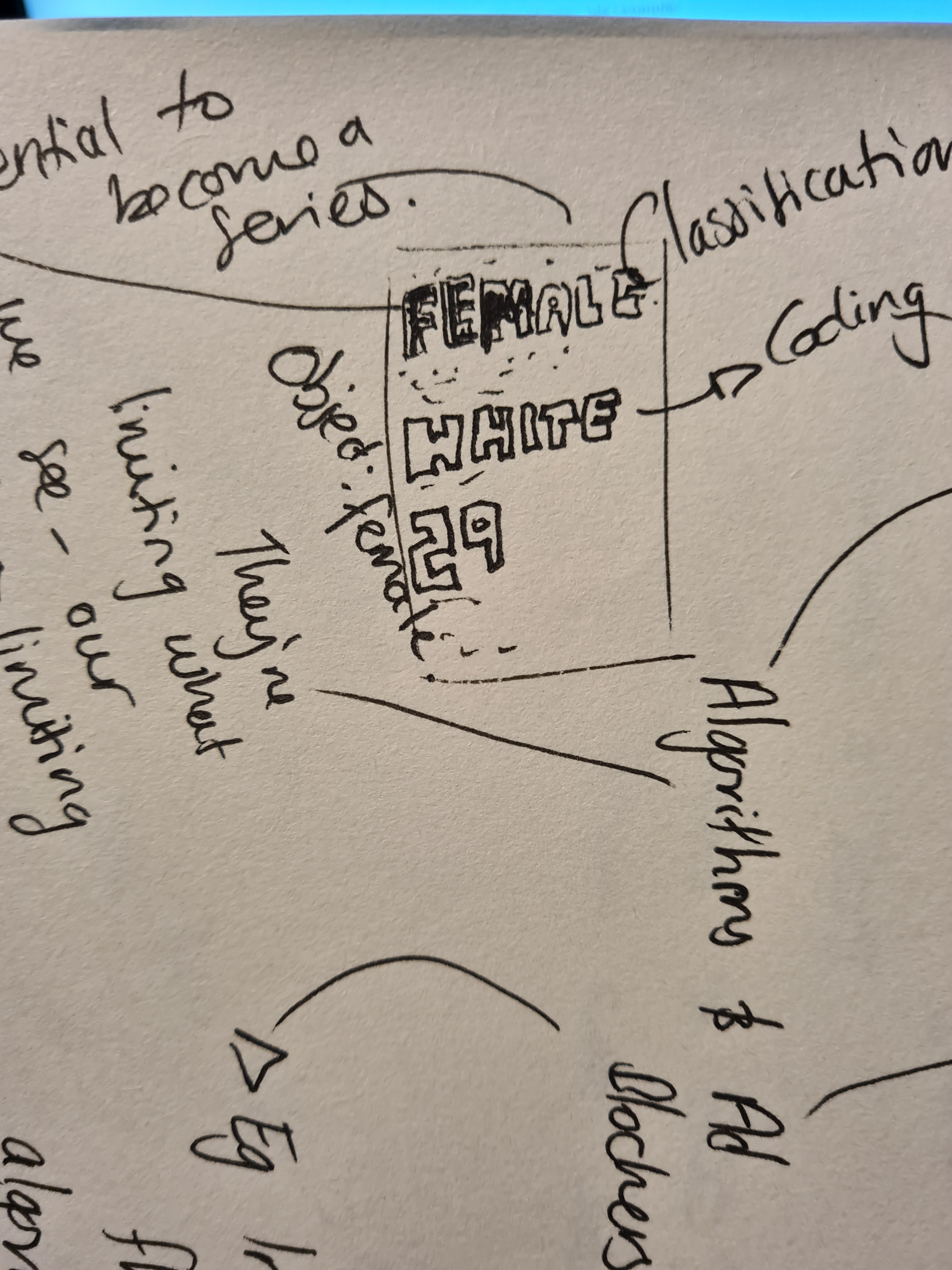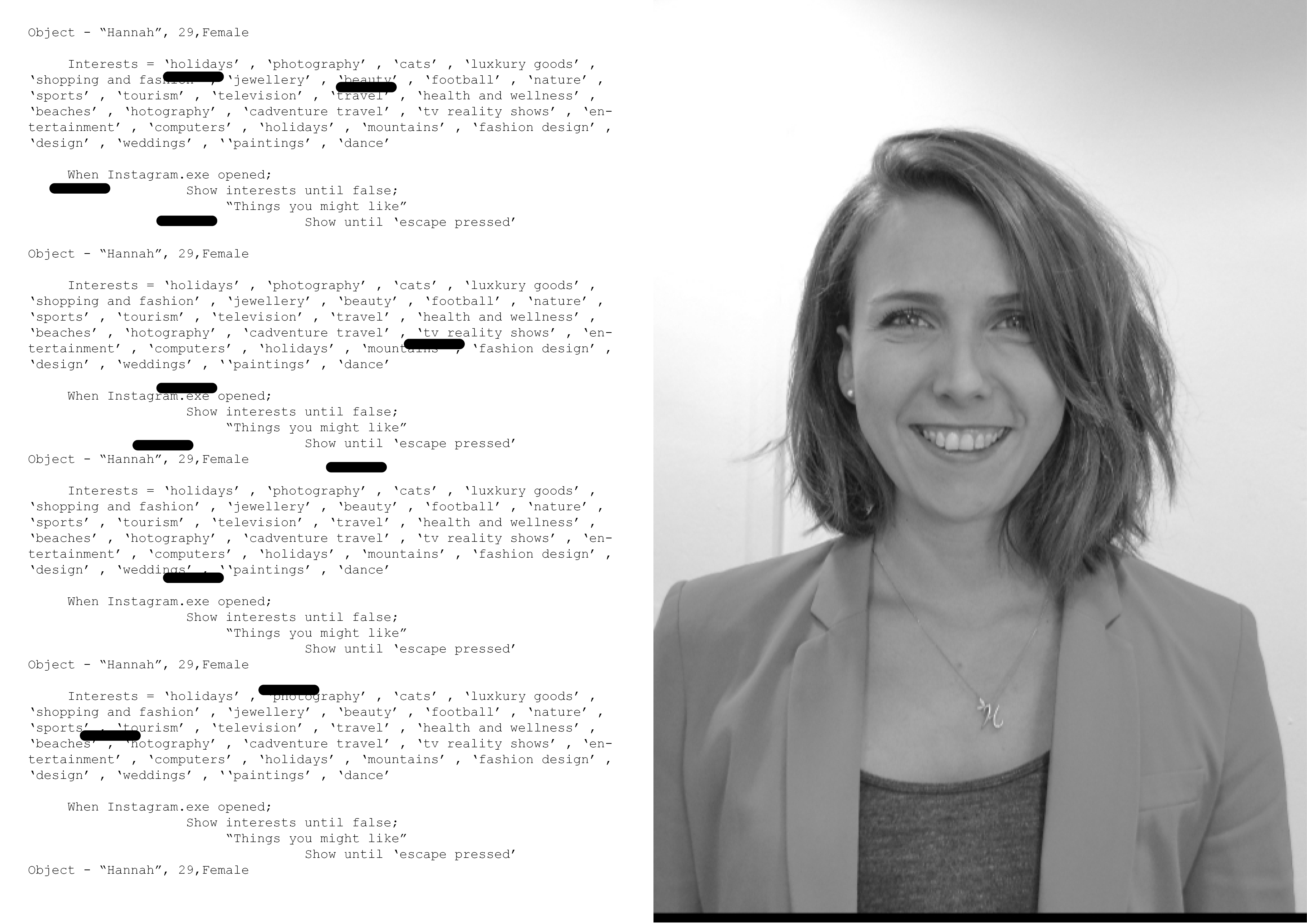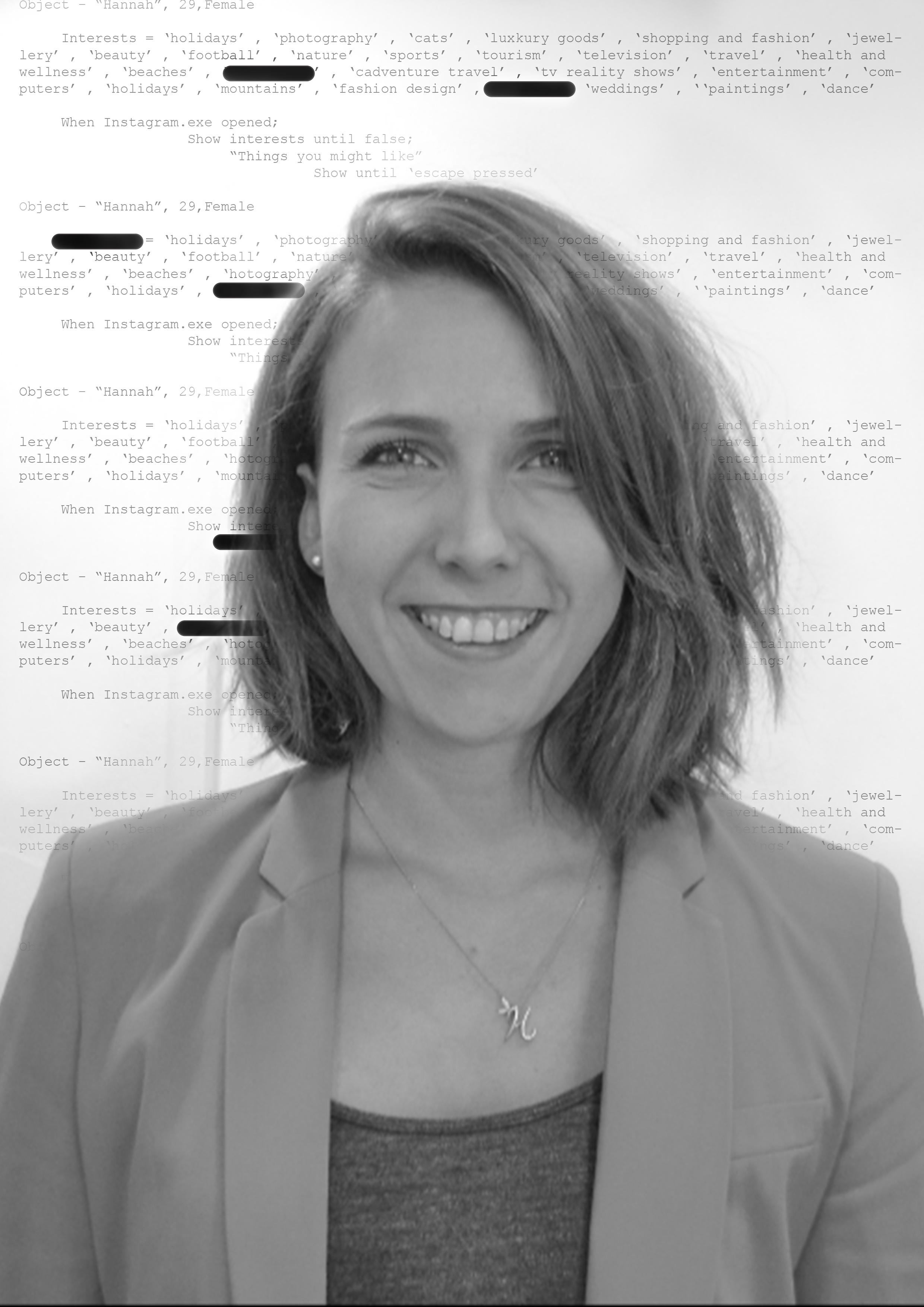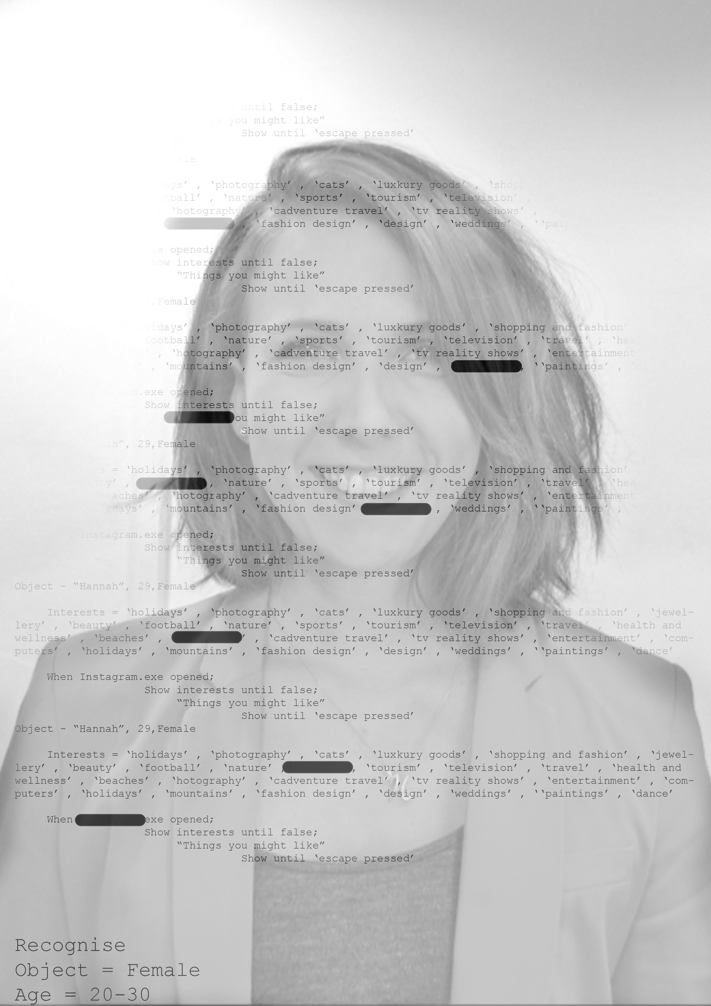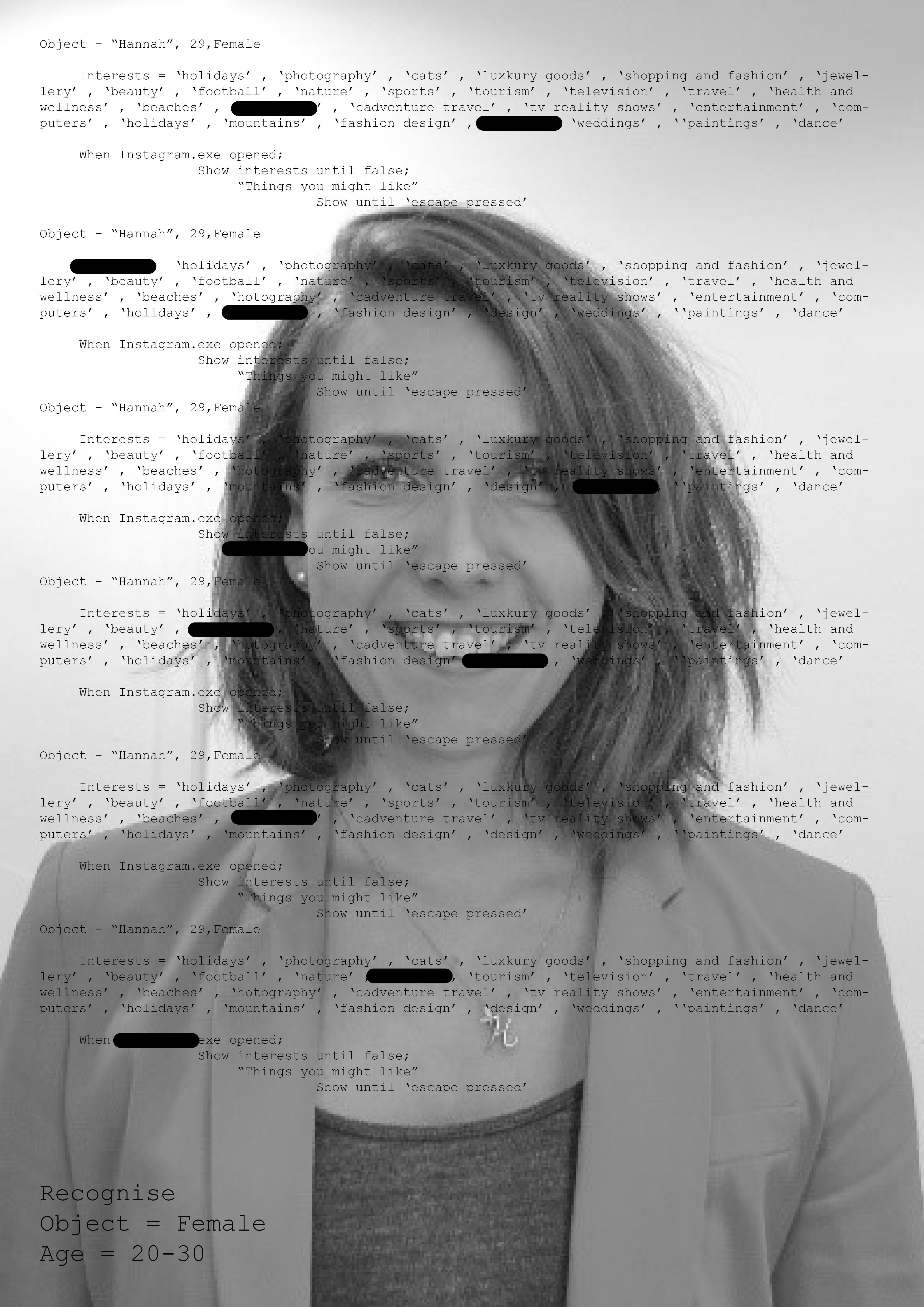 In all, there is an inherent bias to targeted ads – I’ve witnessed this first hand being a white, 29 yr old female, despite my constant blocking or removing of certain beauty adverts or clothing ads that I don’t want to see, I still get them – because I fit into that “category”. Like Mimi’s work, we are just classified on a daily basis and this is the foundation of the content we’re shown. The piece will be combined of 3 parts to each portrait, *Algorithms*, *Censorship* and *Categorisation*… Each person will provide me with their Instagram generated list (with their approval of course, GDPR and all) and I will represent this data as a “usable” written code. The daily censorship we are facing will be represented with redacted parts to the coding. All this will be combined with the portrait – we are individuals but are limited to just a list of code at the end of the day. We can go against this and say we’re obviously so much more and we expereience so much more day to day – but do we?? We’re constantly on our phones, surrounded by computers, consuming the information fed to us by the media – all curated specifically for us and our interests.