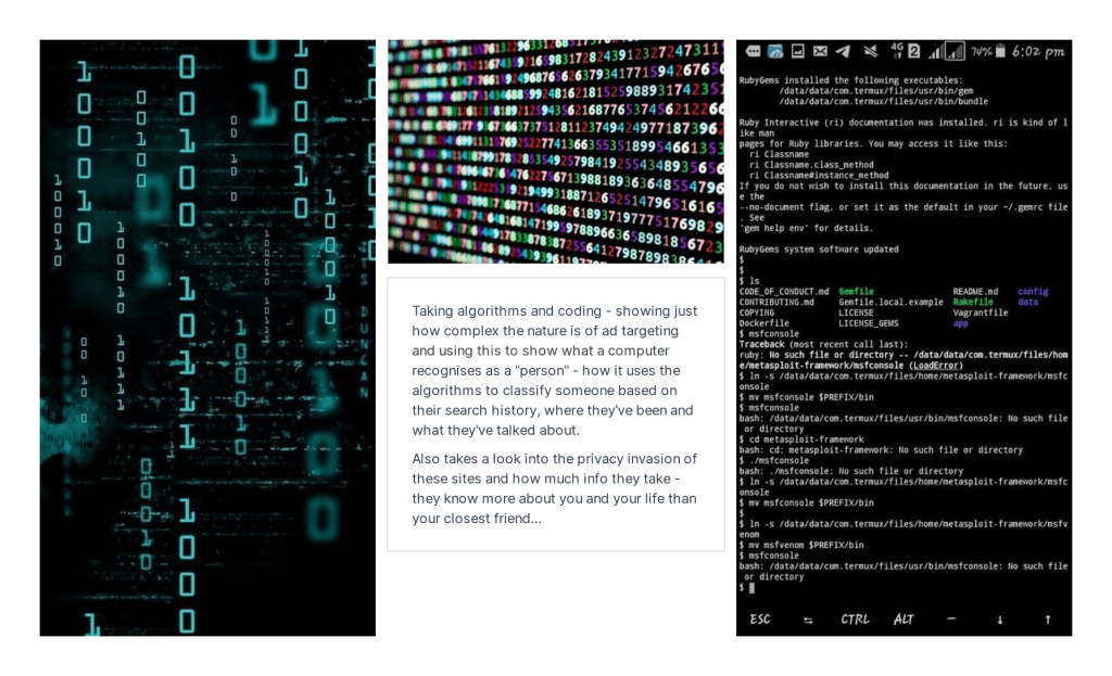 So I don’t have many visual references for this – predominantely because they are ALL the same! I am learning coding and how to write algorithms alongside my fiance who is studying Computing and IT. From this point of view, it purely represents how a computer acknowledges us as humans in a really visual way. It’s confusing to the average person, it’s a jumble of numbers and letters, but behind it all, those numbers and letters sum up exactly who we are – what we Google late at night, the takeaways we prefer, the people we stalk on Instagram… It’s terrifying but beautiful, I see such an incredible dystopian beauty around coding and algorithms and I want to utilise this in some way. I think perhaps I need to make it look a little different to every other piece of “futuristic” coding design…