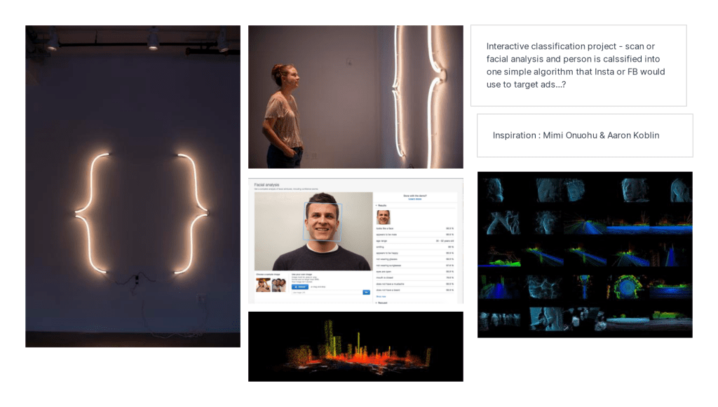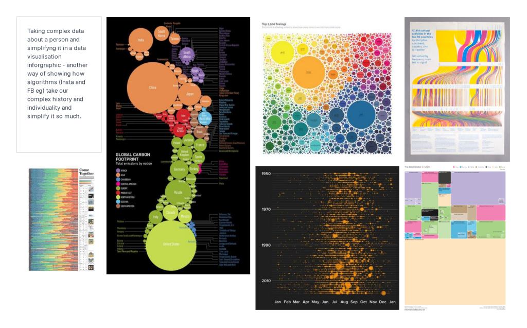 So this first moodboard is one possible way of representing what I’m trying to portray – I guess if I wasn’t writing this in Week 3 and had an unlimited time for this project I’d 100% go for this – my intention would be to have some facial recognition software or facial scanner that would assess the person standing in front of the scanner and would create an algorithm for that individual. The purpose here would be to reflect how a computer sees us and translates our interests and personality into a long sheet of illegible code/algorithms. It would be such an impactful and meaningful exhibition. Mimi Onuohu did something very similar – her camera would scan two people stood side by side and the brackets would light up if it recognised them as similar – processing the categories the computer was given and alloting these people in the same one if they matched – eg. female, similar face shape etc. Aaron Koblin also covers a lot of interactive data visualisation which I guess this is, his work really helped me focus on how the coding doesn’t need to be understood, just accurate and presented in a way that both worked and was recognised.