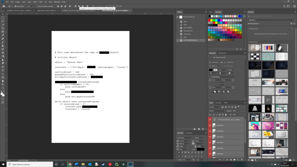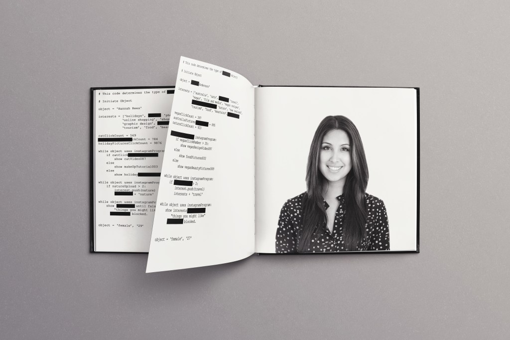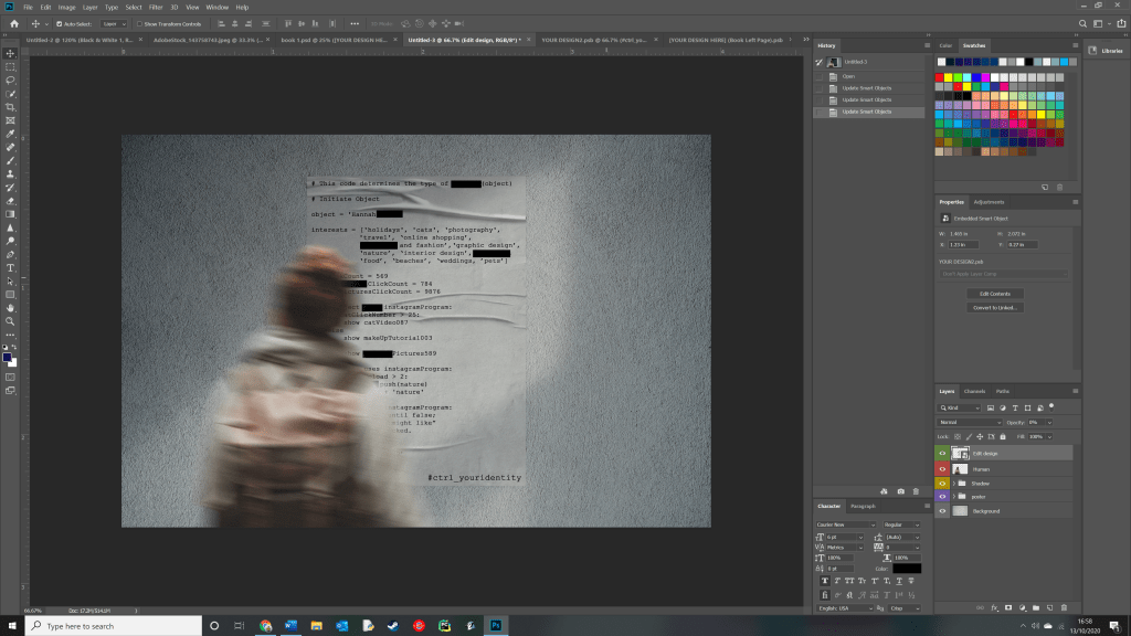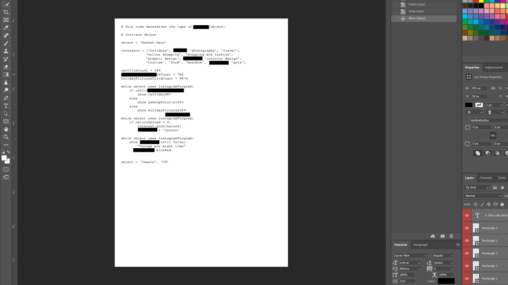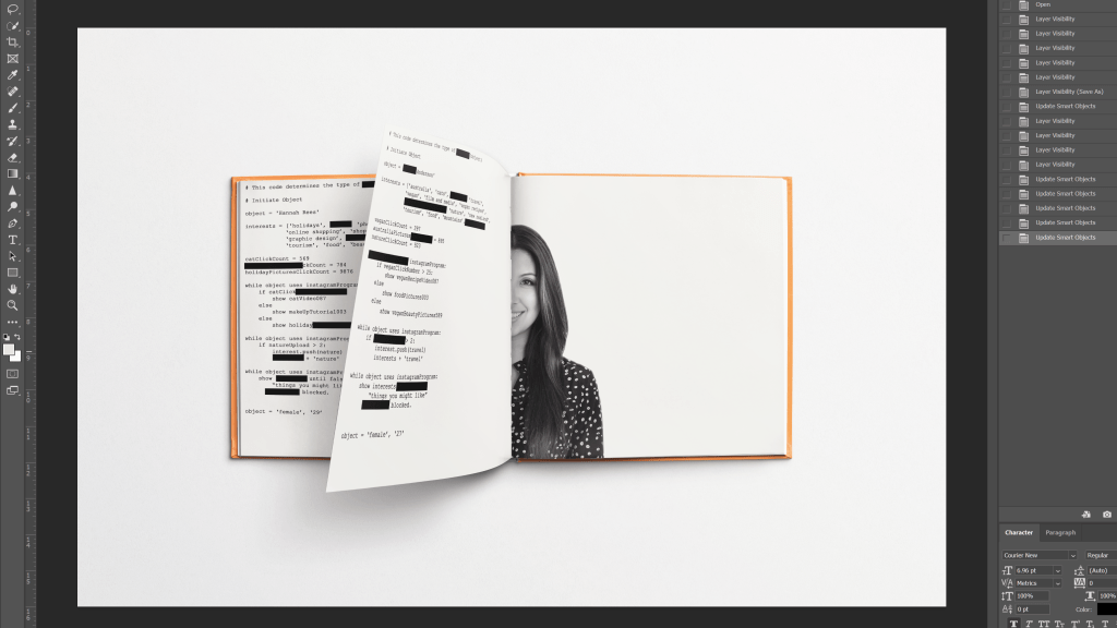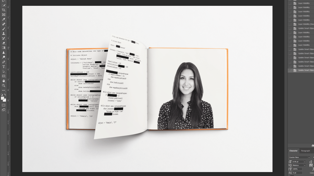 As the above pictures show I decided to write the coding into the Python programmer with the help of my other half – I then copied this into photoshop using templates I’d previously chosen. I was unable to replicate the tracing paper over the coding but I actually really like the almost aggressive nature of the black redacted parts against the softer background. The black and white imagery also reflects that we are all viewed the same.