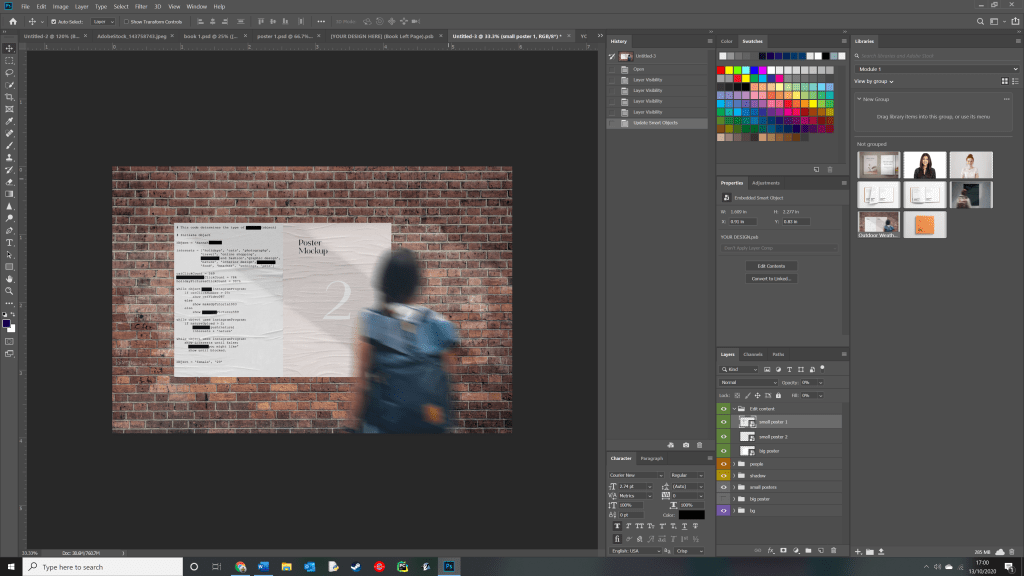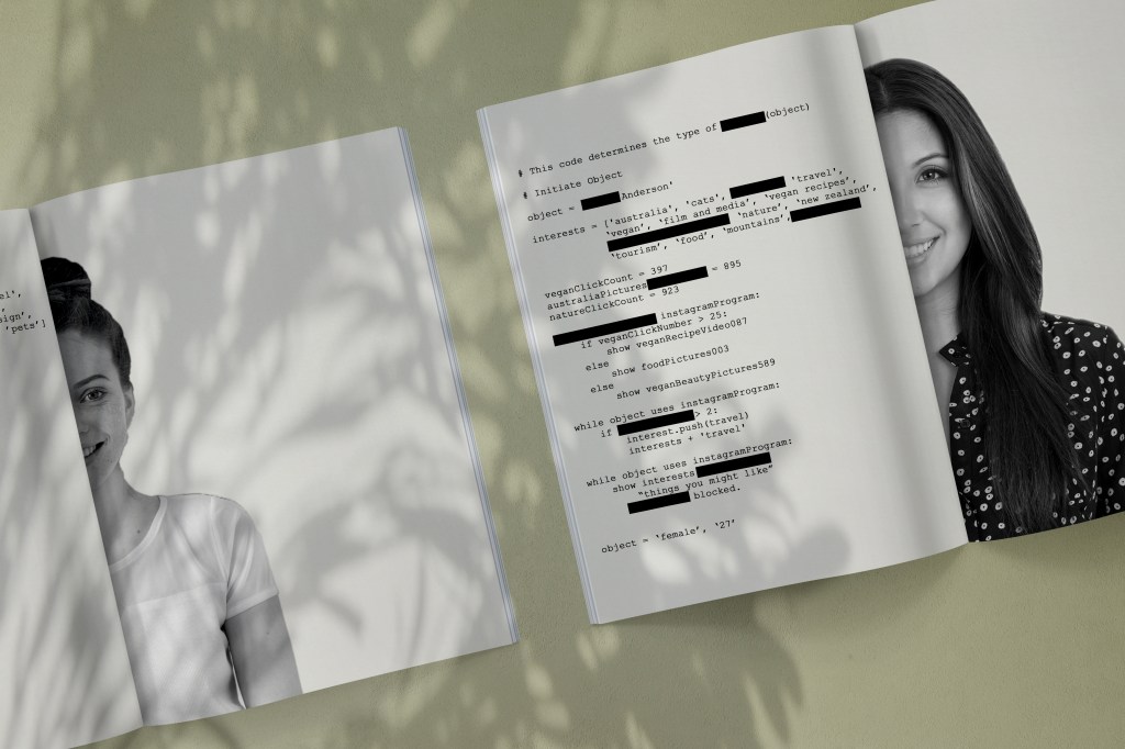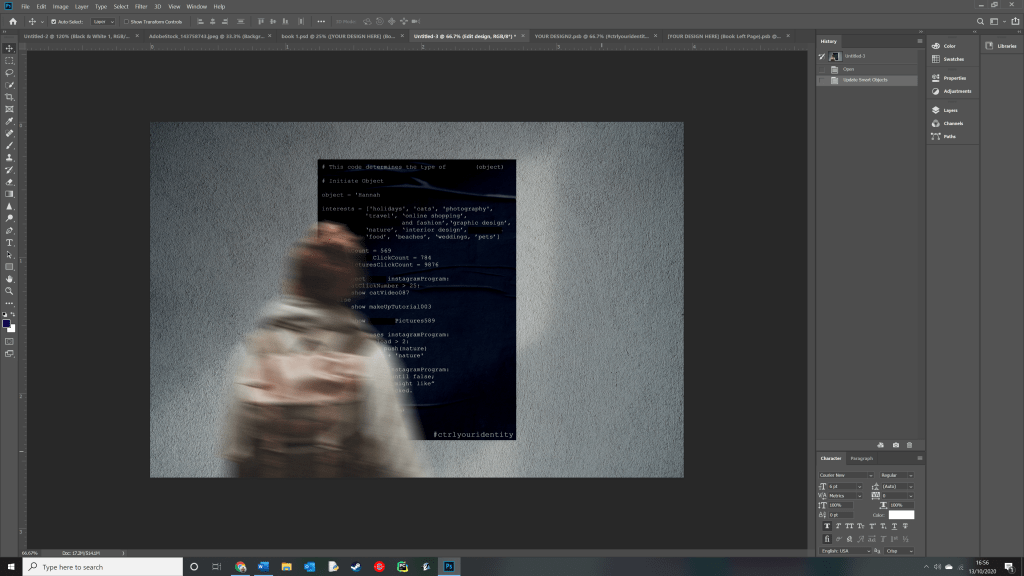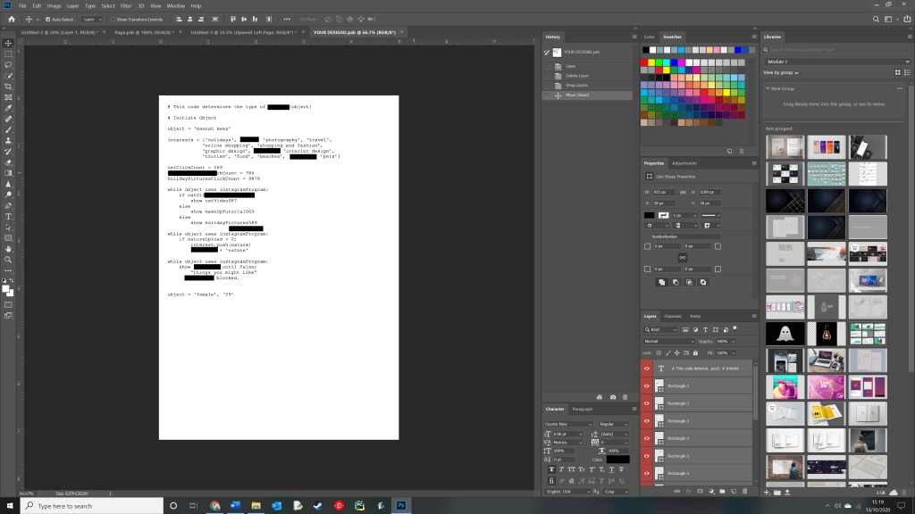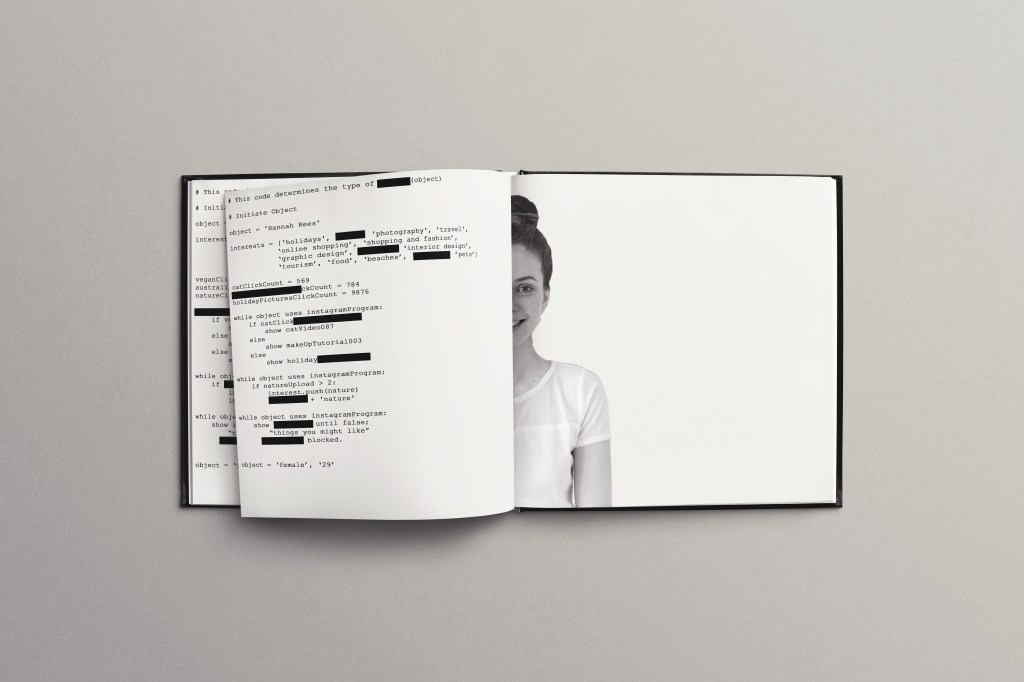 As the above pictures show I decided to write the coding into the Python programmer with the help of my other half – I then copied this into photoshop using templates I’d previously chosen. I was unable to replicate the tracing paper over the coding but I actually really like the almost aggressive nature of the black redacted parts against the softer background. The black and white imagery also reflects that we are all viewed the same.
