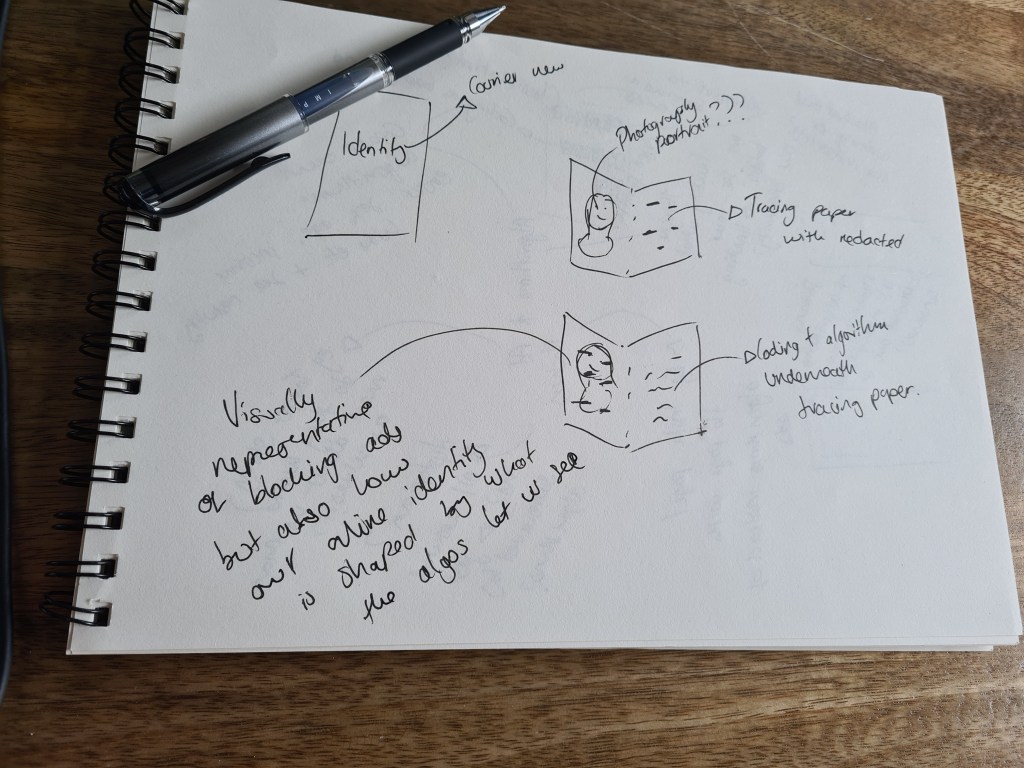 Therefore I feel it needs to be a combination of a representation of that person in the form of a portrait along with how the sites see us. Below are my initial scribbles as to how I feel this piece should look. I also want to create one for each person I evaluate and look into.