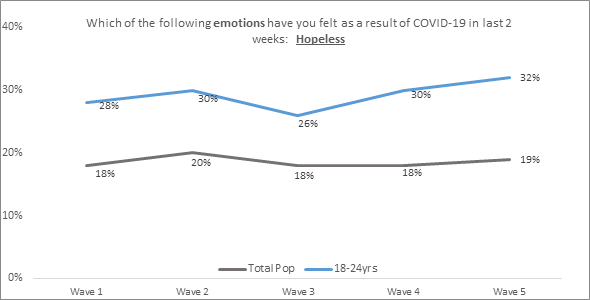 One thing I’ve noticed through reading this study, is the huge impact the pandemic has had on young people aged 18-24. This graph shows they are much more likely to feel hopeless or lonely – there’s a very evident divide between young adults and the older population. The number of adults aged 24+ who felt able to cope with the stress of the pandemic fell from 73% to 64% from Wave 6 to Wave 7. The number of young people aged 18-24 who felt able to cope with the stress of the pandemic fell from 64% to 56% from Wave 6 to Wave 7.