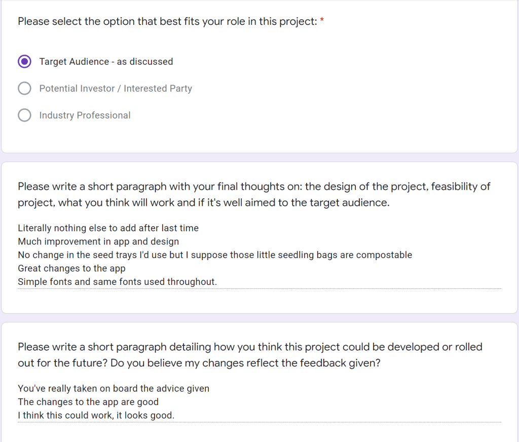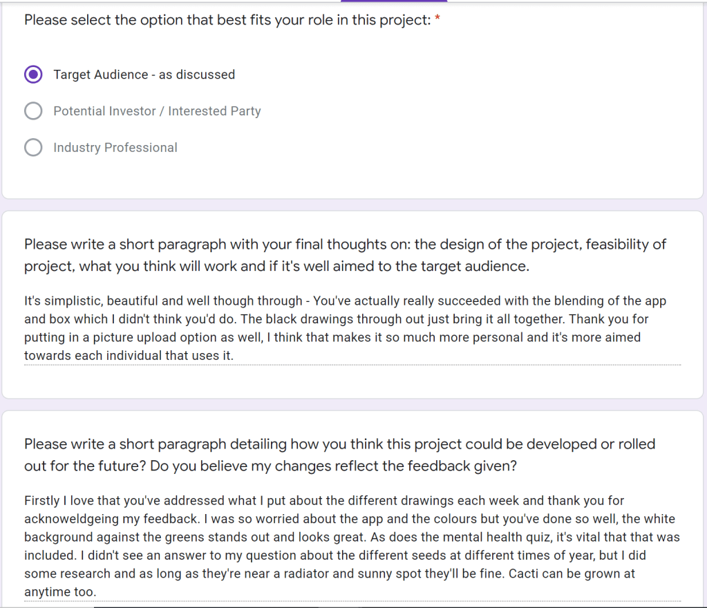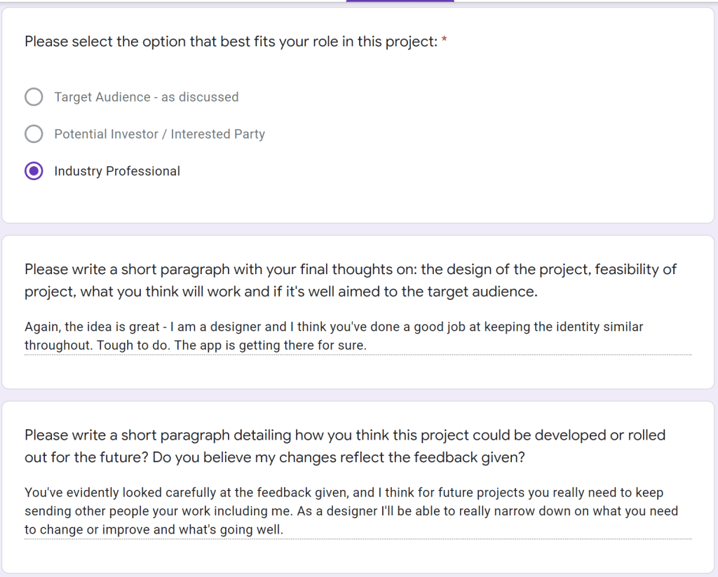 I’ve been sending this product out to my target audience at each step and have been using their advice to make tweaks here and there. My idea is for next week to collate these responses and use these to show how I’d plan the next projection of the product. I’d also like to see how they feel i’ve used their feedback and valuable insights to help my work progress.