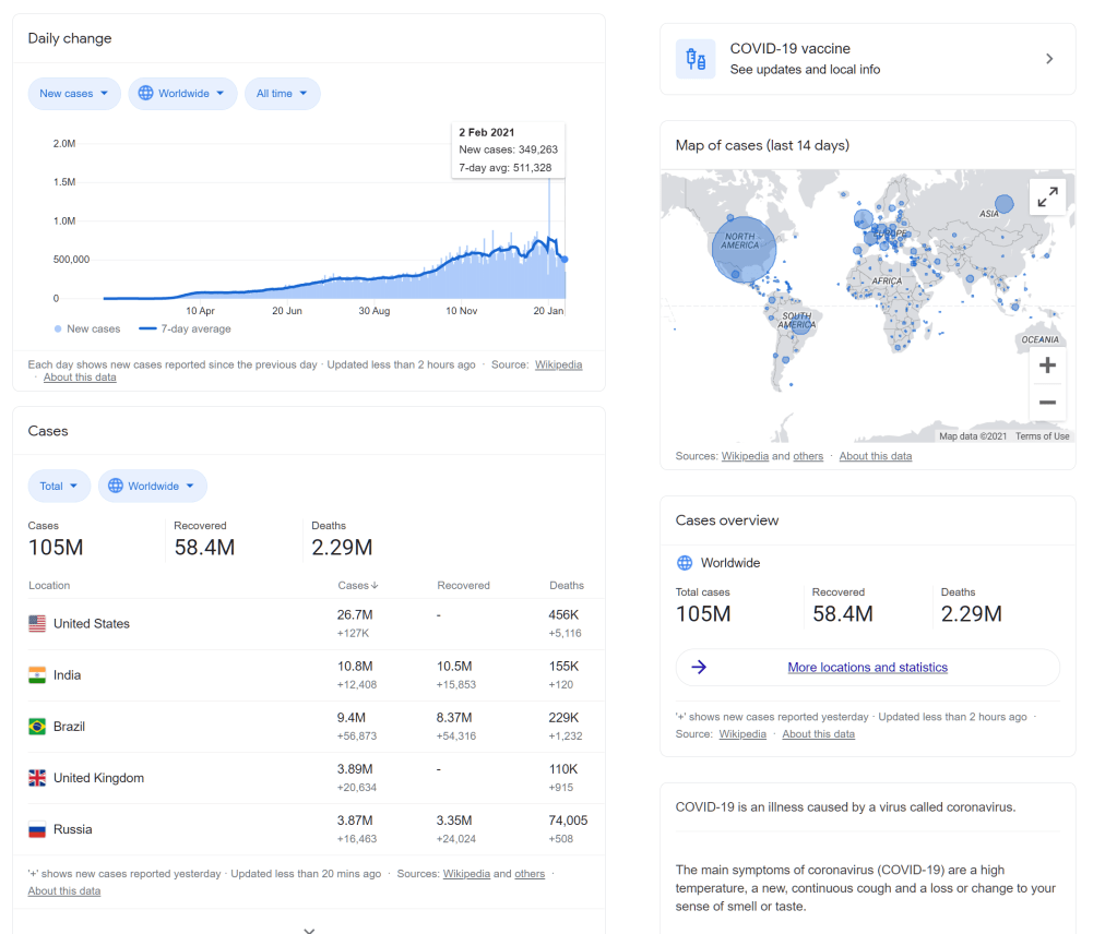 Take the current pandemic, every single day we’re reading new stats, new figures and absorbing so much information that changes on a daily basis. How do we filter out the truth from the falsified information? How can we truly understand and retain these multiple figures and facts? Every time Chris Whitty asks for a new slide we get a whole new TV screen filled with data and charts. Even now, if I google “covid 19 world”, Google provides me with an up-to-date, constantly developing inforgraphic with all the information I might want: