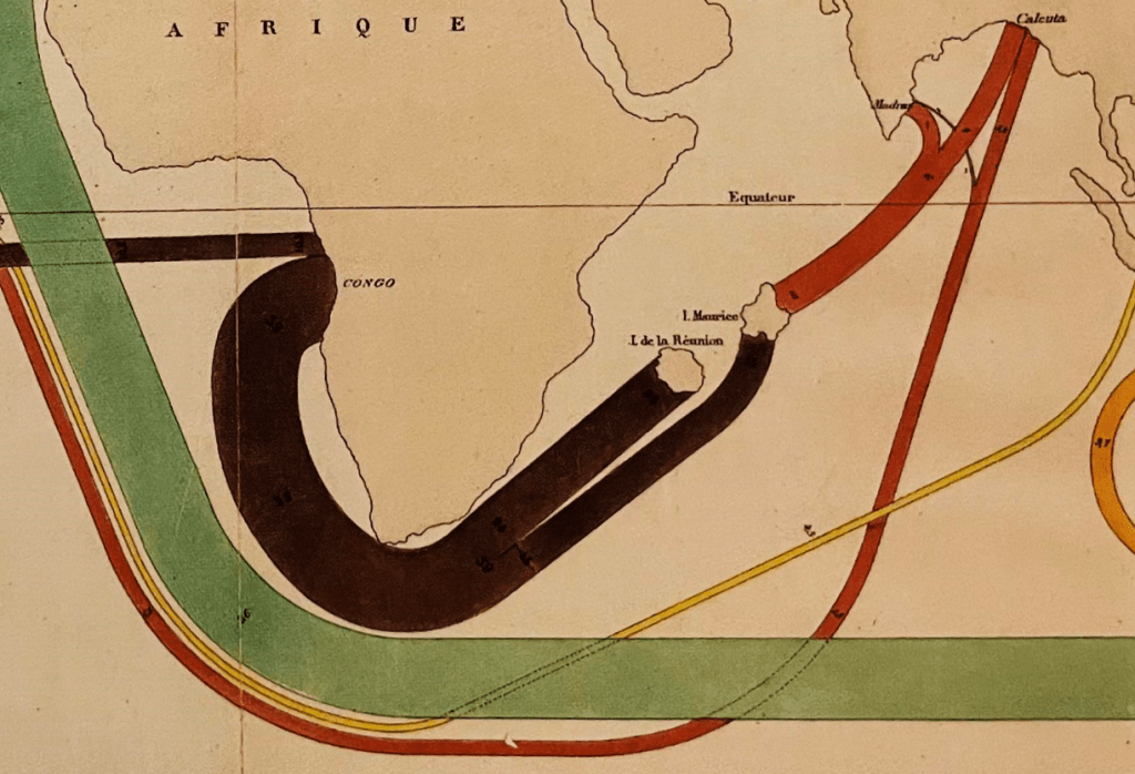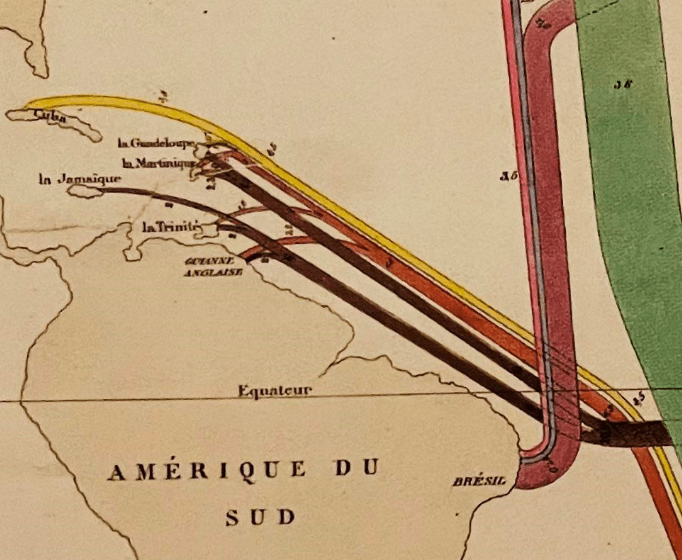 The African to European colonies emigration is clear also on this map, from Africa to the Indian Ocean Islands of Reunion (French) and Mauritius (English) represent the labour needed to run the sugar plantations there. The thinner lines suggest African labour was still flowing to the Caribbean islands of Guadeloupe, Martinique, Jamaica, Trinidad, and Guyana. The size of the lines help in understanding that three times as many Africans were taken to Mauritius and Reunion as went to French and British territories in the Caribbean.
