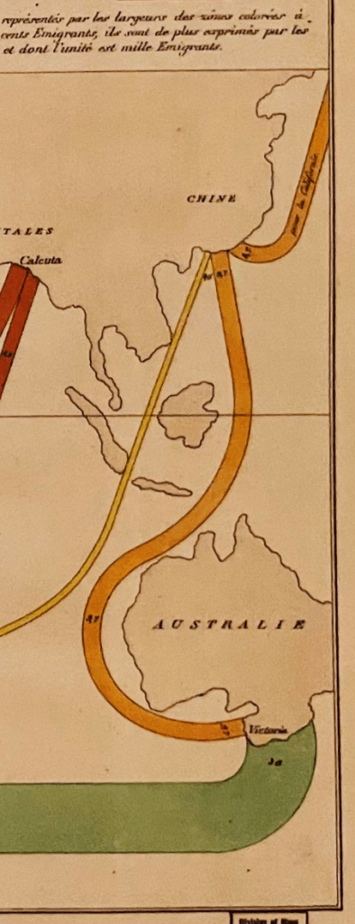 Take, for example, the Chinese emigration lines – one running to Australia, joining the line from England. One line running across the Atlantic to the Caribbean and the other towards California. These different lines demonstrate the different movements from one country and the number of different ports.