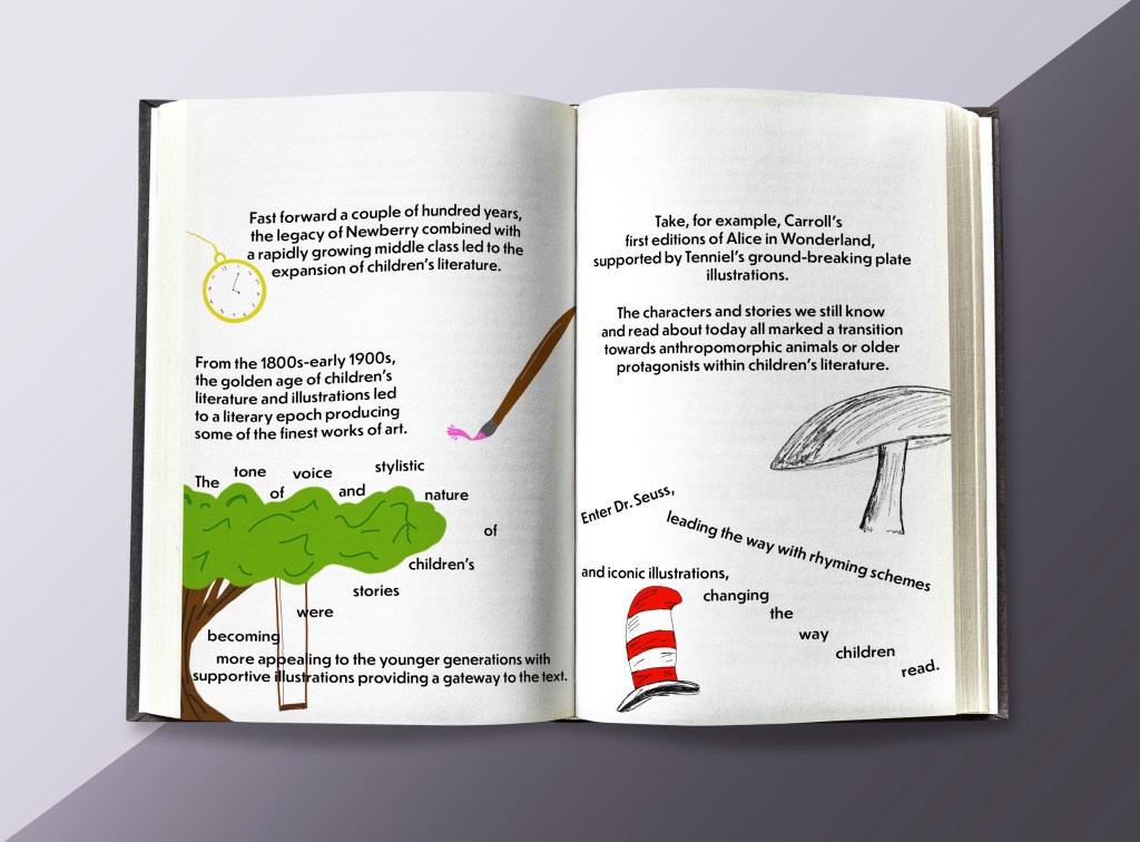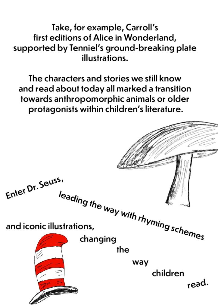 Fast forward a couple of hundred years, the legacy of Newberry combined with a rapidly growing middle class led to the expansion of children’s literature. From the 1800s-early 1900s, the golden age of children’s literature and illustrations led to a literary epoch producing some of the finest works of art. The tone of voice and stylistic nature of children’s stories were becoming more appealing to the younger generations with supportive illustrations providing a gateway to the text. Take, for example, Carroll’s first editions of Alice in Wonderland, supported by Tenniel’s ground-breaking plate illustrations. The characters and stories we still know and read about today all marked a transition towards anthropomorphic animals or older protagonists within children’s literature. Enter Dr. Seuss, leading the way with rhyming schemes and iconic illustrations, changing the way children read.