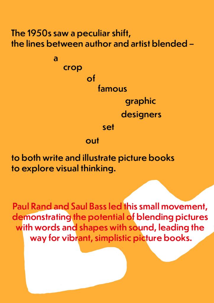 The 1950s saw a peculiar shift, the lines between author and artist blended – a crop of famous graphic designers set out to both write and illustrate picture books to explore visual thinking. Paul Rand and Saul Bass led this small movement, demonstrating the potential of blending pictures with words and shapes with sound, leading the way for vibrant, simplistic picture books.