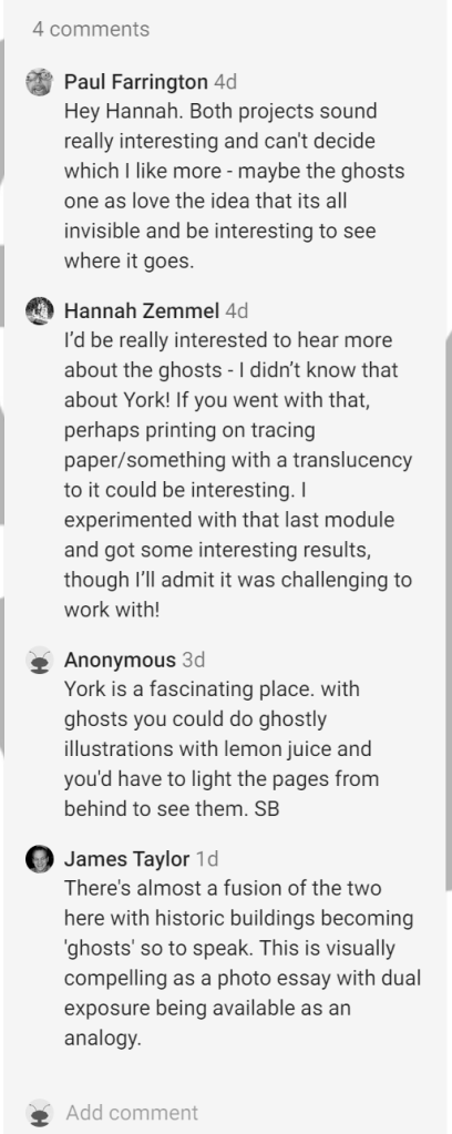 This is really useful and all seemed really interested in the subject. I found the idea of lemon juice really interesting, this isn’t something I’ve done before so gives me a chance to experiment. I’m also really attracted to James’ thoughts, I was initially very drawn to the idea of a photo essay and I think it’s something that could be really powerful as a tribute to the historical “ghosts” of Yorks past in the sense of buildings forgotten or lost. For me, this is where I have more of a passion, I’ve studied the York ghosts before, and , despite it being a rich topic with a lot of information and fun myths, I feel I would get something more powerful out of the lost buildings. The experimentation with dual exposure also really appeals as it’s something I’ve experimented with before and would love to try it again.
