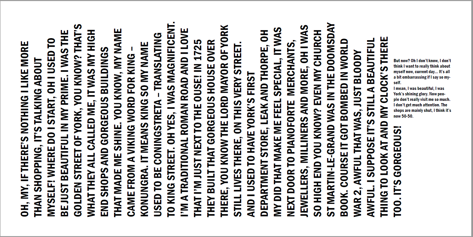 I want to really utilise the characteristics of each street in what’s being said, it needs to be powerful and hard hitting and it needs to be very “in your face”. York has a traditional history of being very “quaint”, cobbled and quiet but it gets overlooked by the Council and local authorities, in the fact that they believe it’s doing ok and it good financially but the city is in fact in some quite deep shit debt-wise!