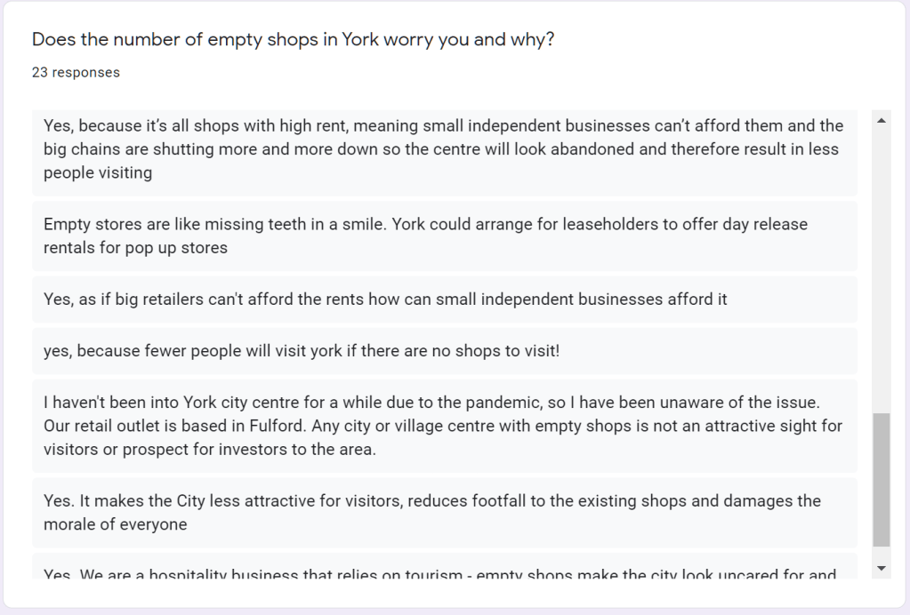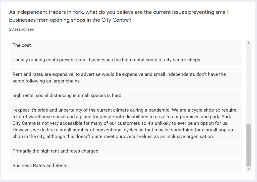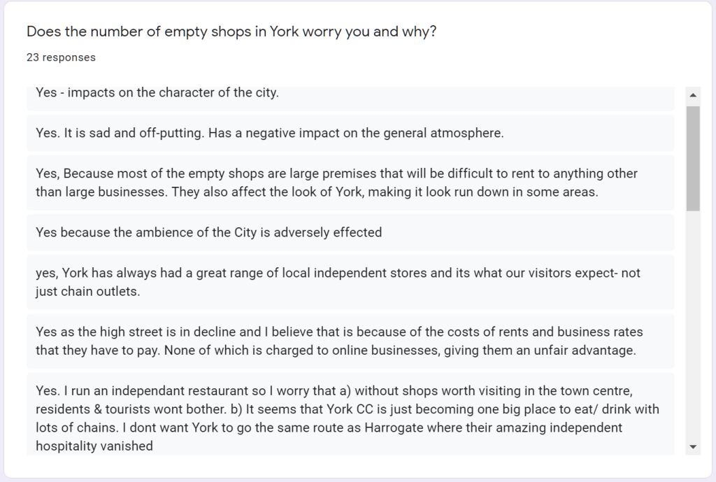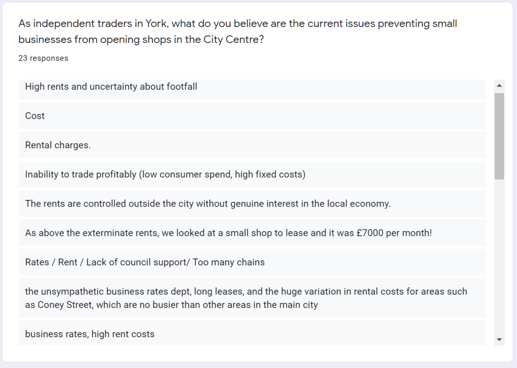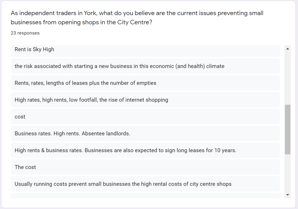 Question 2 : again, I really wanted to get into the nitty gritty and really understand the issues that prevented smaller businesses from opening in the city centre. Again, the same issues were highlighted, high rental prices, profitability, business rates and long leases, and, interestingly, “absentee landlords”. This answer is evidently an issue here in York, majority of our Landlords stem from out of City and cause problems in that the empty stores don’t affect them directly – they don’t feel the impact local citizens feel when walking past empty shops.