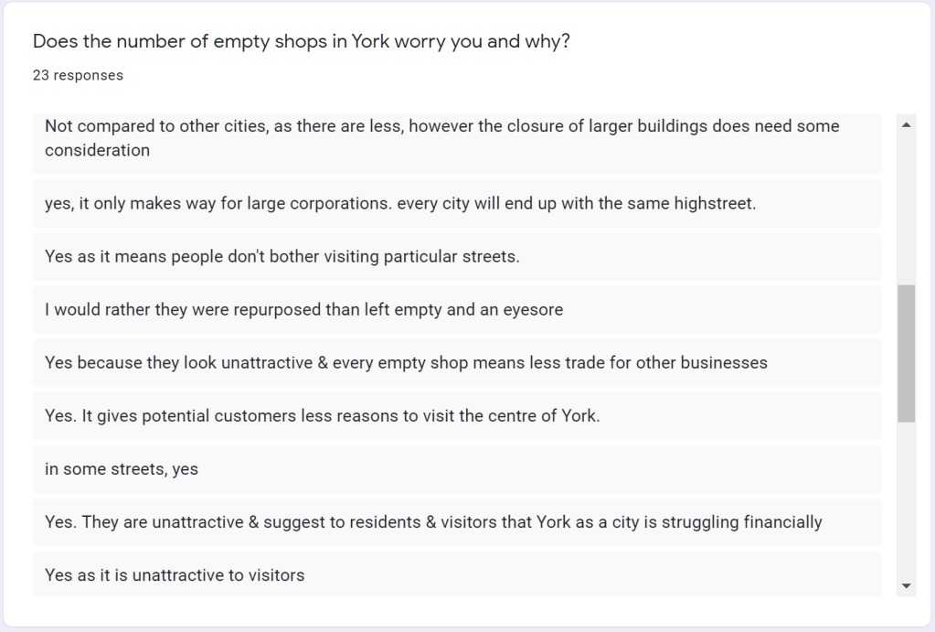 Having just had those 23 responses, I’m on a positive path now and feel like I can really analyse my project with the viewpoint of other York independent retailers.
