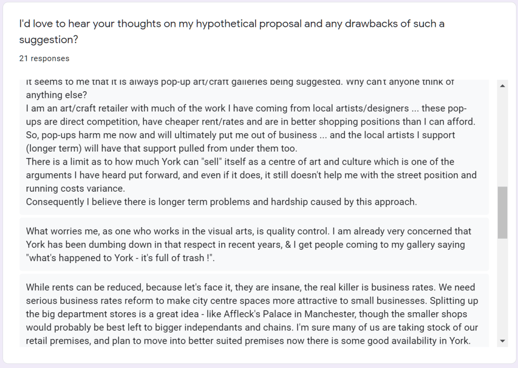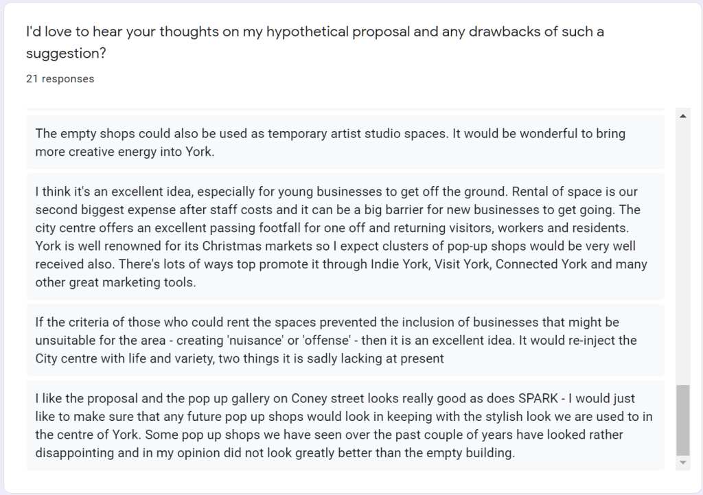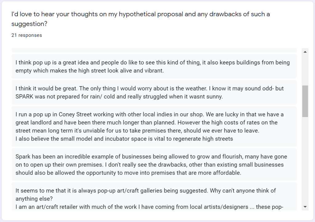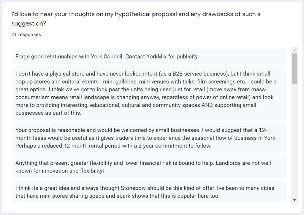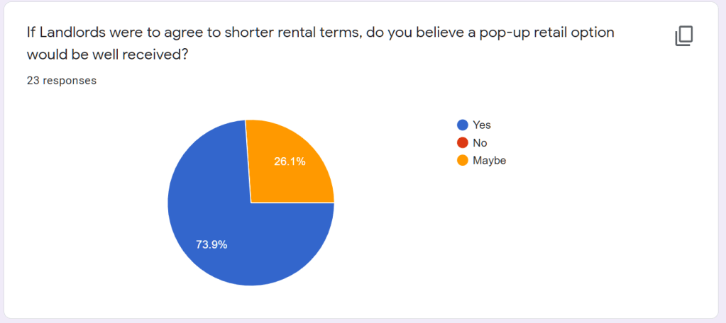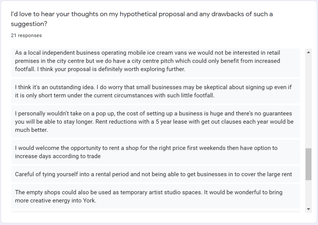 Interestingly, a lot of the responses did warn me that getting landlords on board would be tricky. Had I thought ahead, I would have tried harder to contact landlords of our city centre stores to get an alternative view. This would be my next step to contact landlords and the council to really understand their point of view. There must be a reason for landlords to not want to fill their stores by trying new methods but also I understand that getting rental income is a valuable part of their business.