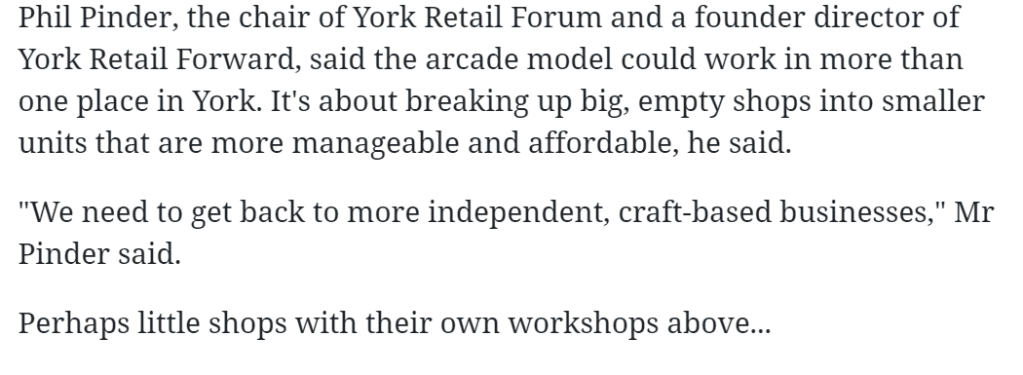 Finally, a recent article in the York Press 4 days ago looked into the possibilty of splitting up rental units and having mini markets within larger retail spaces. This shows that this project has some real backing already, and, although the idea of splitting up retail units isn’t new, this could really pave the way for a new York and introducing vibrancy and colour to a very historic yet tired city.