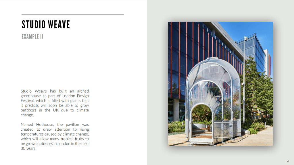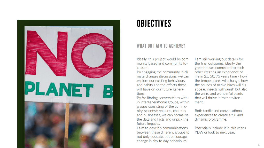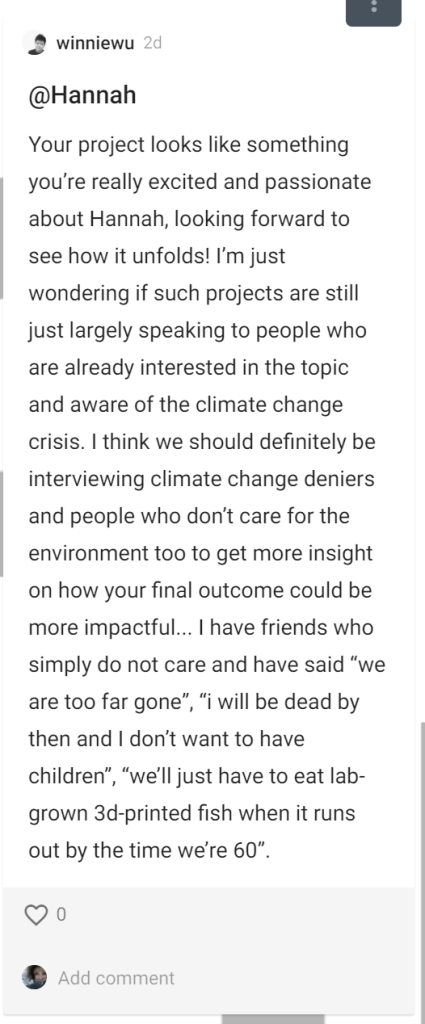Ooooh so I love Winnie’s idea of Climate Change deniers – this is such a huge topic because there are still so many people out there who refuse to believe this is happening. Perhaps again this could be something to touch on with the more exhibition like project of the greenhouses. It’s really quite tricky too because how can we get people to change their minds? This is 100% something for me to consider carefully and look into…