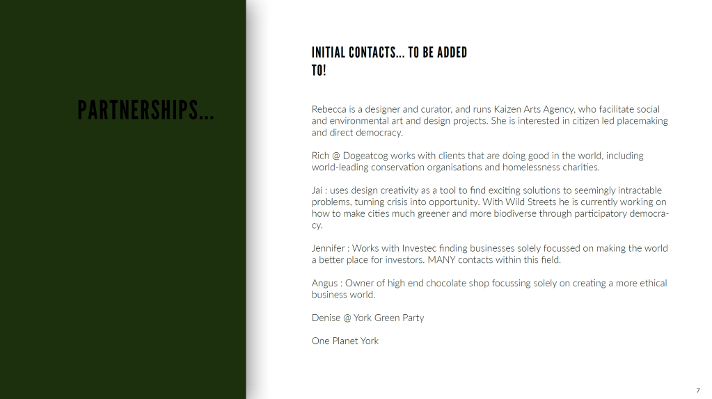 Of course, York Green Party has a huge list of changes they wish to implement, there are a number of contacts here that I am keen to talk to further, and hopefully help understand the ways they wish to implement changes within this City.