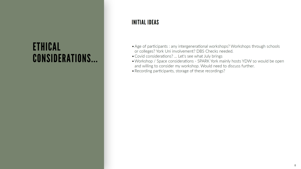 - Experiment with outcomes – workshops / mini films / illustrations / telling stories / begin networking and framing groups to work with