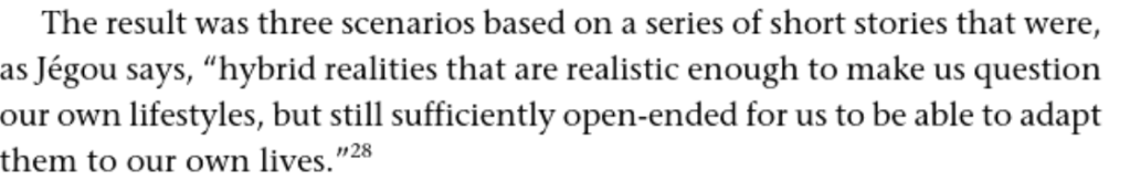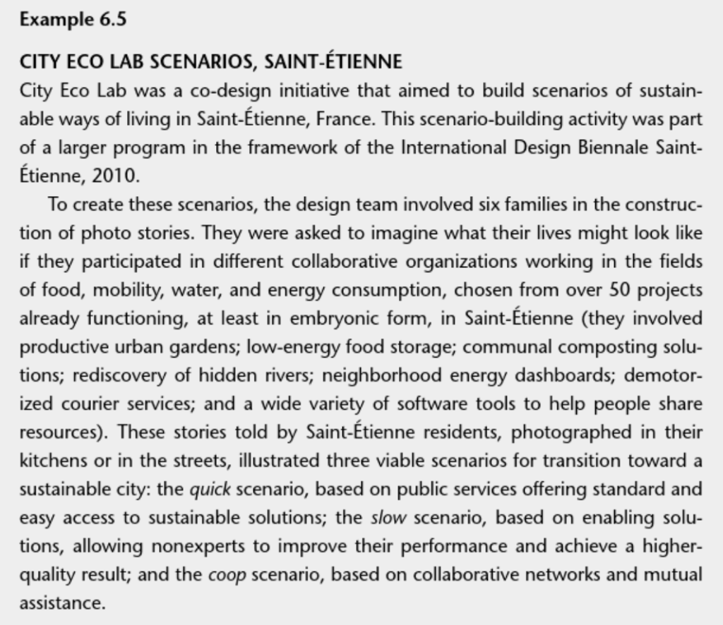 Social innovation based scenarios were also covered in Manzini’s book and I found it really fascinating to read about the successes on community based work by creating semi-truths/hybrid-realities and involving communities to create these exhibitions. It’s storytelling and it’s an enabler for social conversations, it gets people involved, in the same way situational art gets people involved. It’s not jsut exhibitions or good design, they’re conversational prompts and that the bit that makes a difference.
