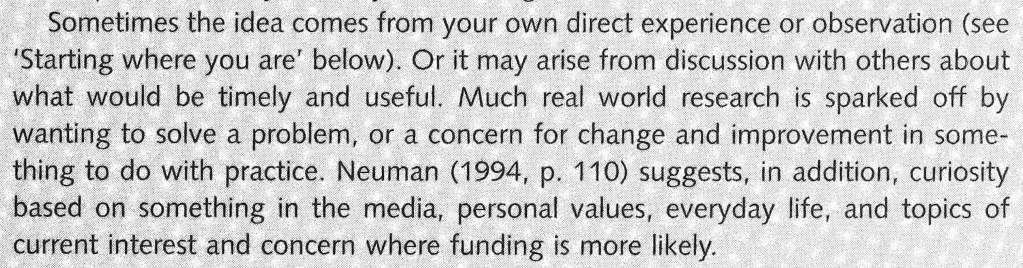 The above excerpt taken from Robson’s book Real World Research, it’s clear that taking an idea or project brief from something you’re already interested is a good start – and I’m definitely doing that! At the moment my research question is fairly tenative but that’s ok. So long as I accept it’ll change over the coming weeks, it’s ok. It’s also interesting to read Mckenna, quoted in Robsons book: