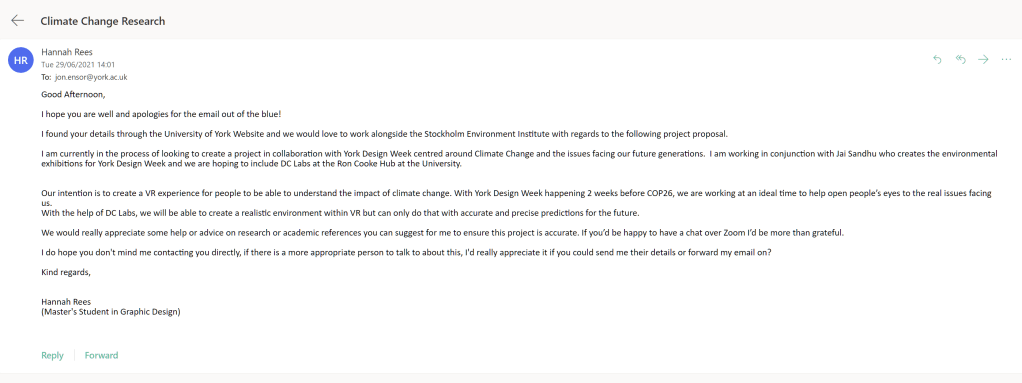 Jai will speak to his colleagues/contacts who know people at DC Labs in York. They might want to be involved in helping us with the VR aspect. He has asked me to contact the people I’ve put on the list in Week 3 so I can start making headway with getting all the info we need.