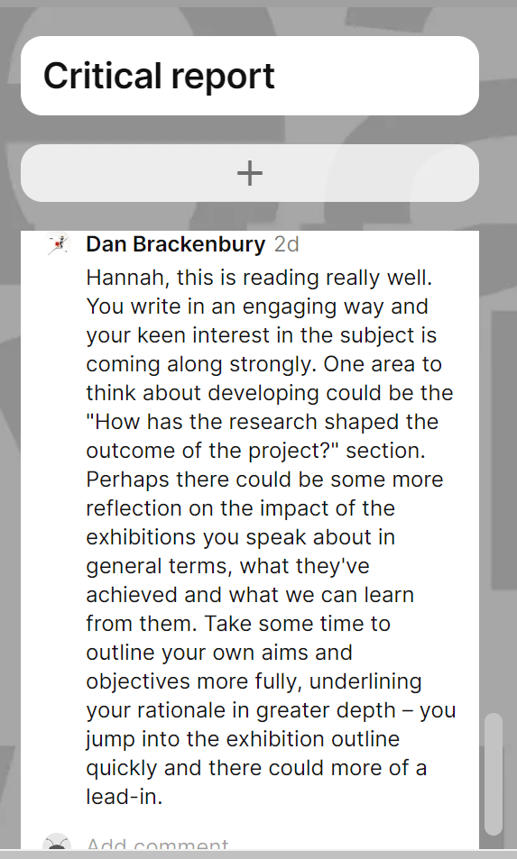 His main focus of feedback was developing on the reflection on the impact of the exhibitions I’ve spent time researching. Upon reflection I acknowledge I haven’t spent much time reflecting on these case studies and this is where I need to improve.