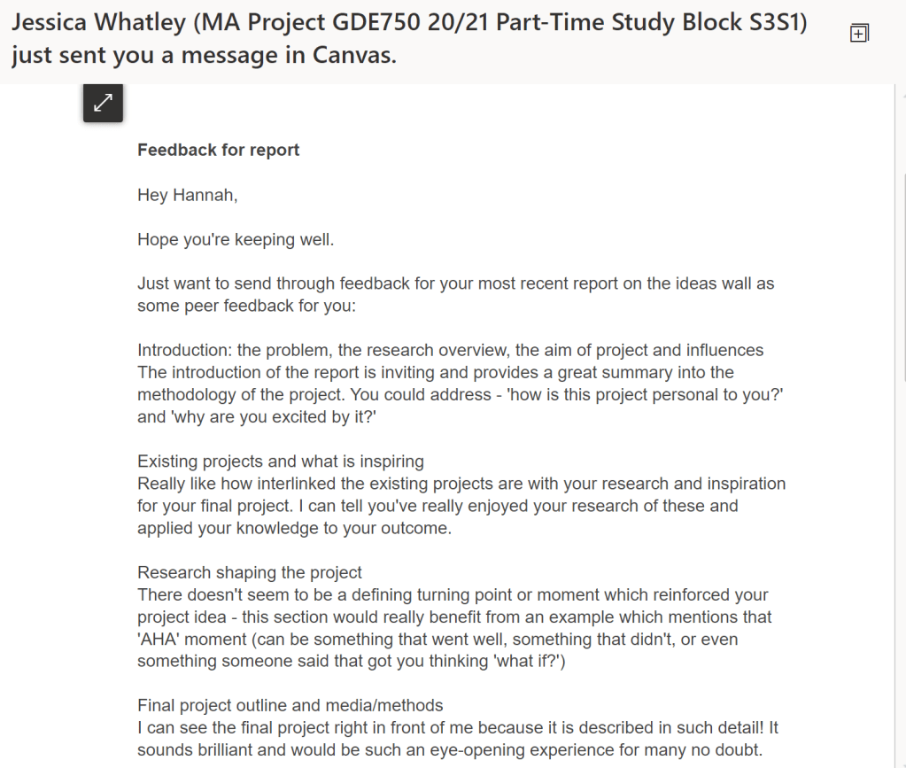 Above is a screenshot of Dan’s feedback from my latest draft I posted onto the Ideas Wall. It’s really valuable feedback and I’m keen to implement it within my work.