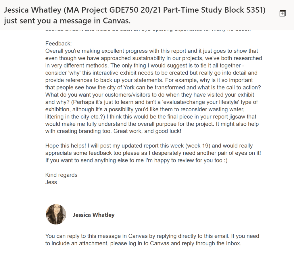 I was also lucky enough to get feedback from my peer Jess – we had a conversation last week to discuss our projects and it really helped me to put my ideas into words and get across the topic succinctly. I can’t thank her enough for her help here and encouraging me to get the motivation required to complete this proposal.