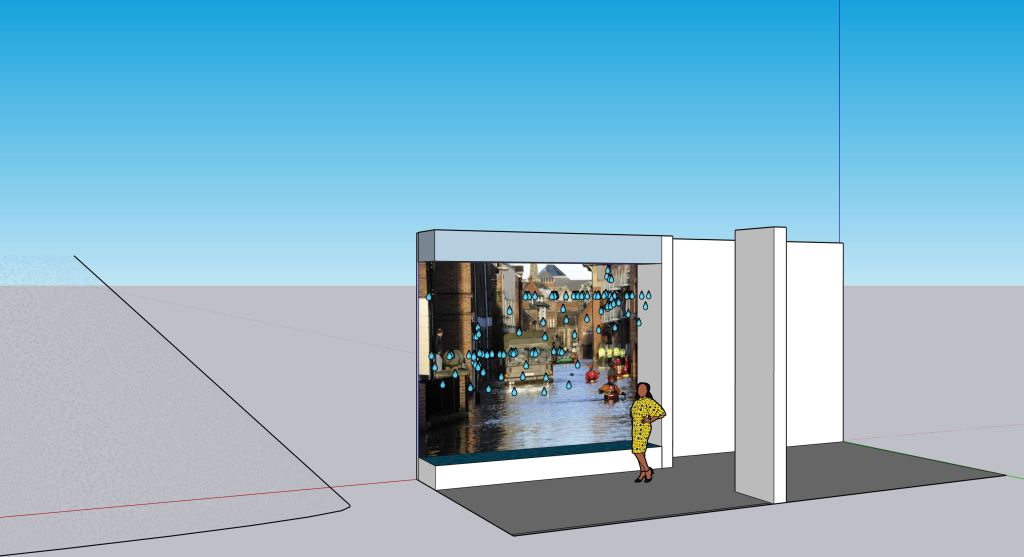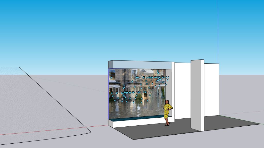 I then considered the other room and the idea of bringing in recylced rain to fall in front of the images – visitors can touch and feel this water as it’s pumped round the system. This space would be quiet and reflective with the sound of the water.