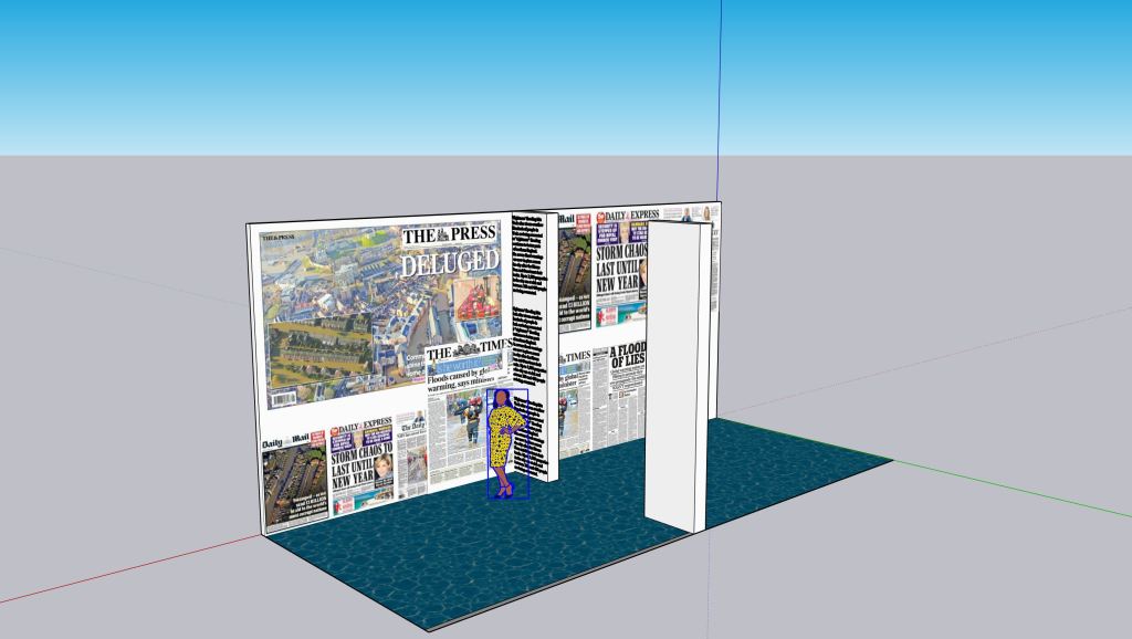 I recreated the first layout of the room that would be available at the Art Gallery – here you can see it’s divided into two spaces which works well for blowing up the news articles and wording for impact